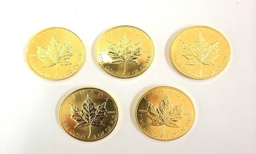 表面にエリザベス二世の肖像、裏面にサトウカエデの葉が浮き彫りされているカナダメープル金貨。